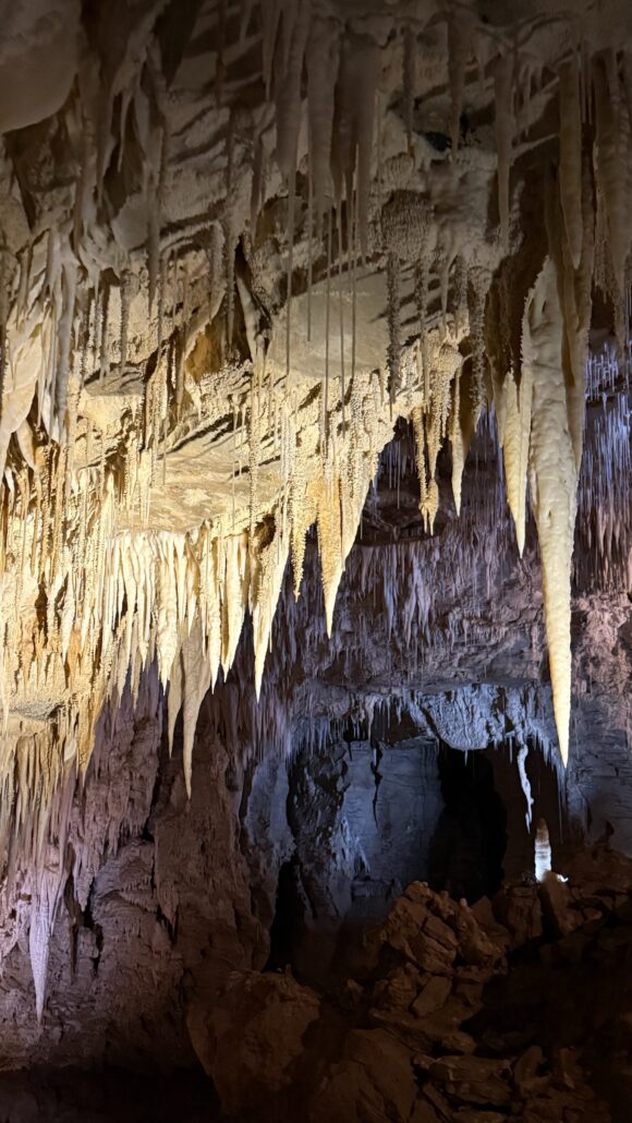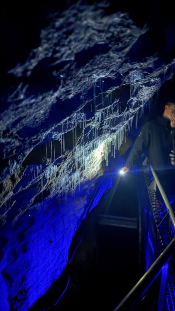 Nous continuons vers le nord et visitons une grotte à Waitomo, coin réputé pour ses vers luisants. Ces minuscules insectes bioluminescents illuminent les voûtes des cavernes comme un ciel étoilé, créant une ambiance féerique.