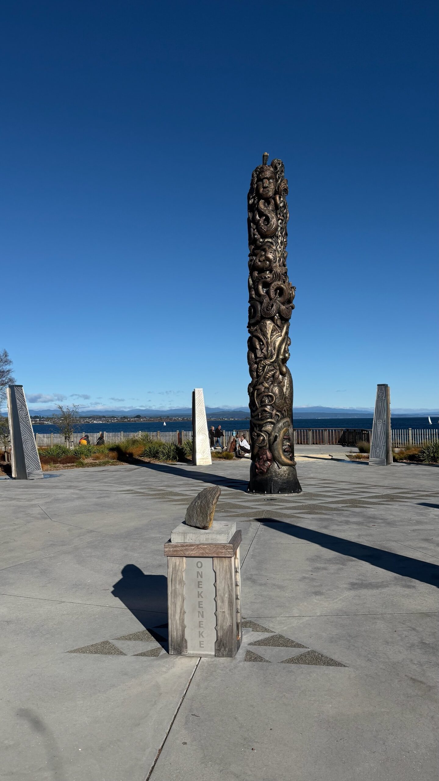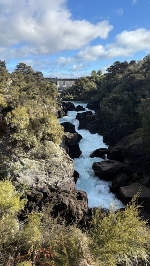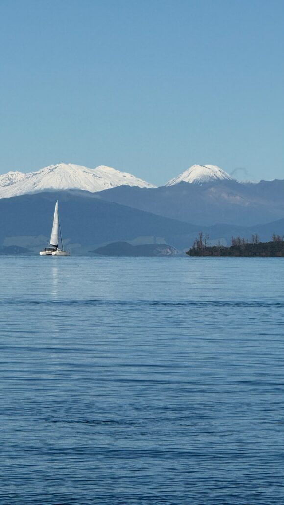 Ensuite, nous reprenons la route vers Taupō, une charmante ville construite au bord du lac du même nom, le plus grand de Nouvelle-Zélande (plus grand que le lac Léman), formé dans l’immense caldeira d’un supervolcan il y a environ 26 500 ans. Le lac a des allures de mer intérieure, avec ses eaux bleues profondes, ses plages de galets et sa vue imprenable sur les montagnes du parc national de Tongariro au loin.