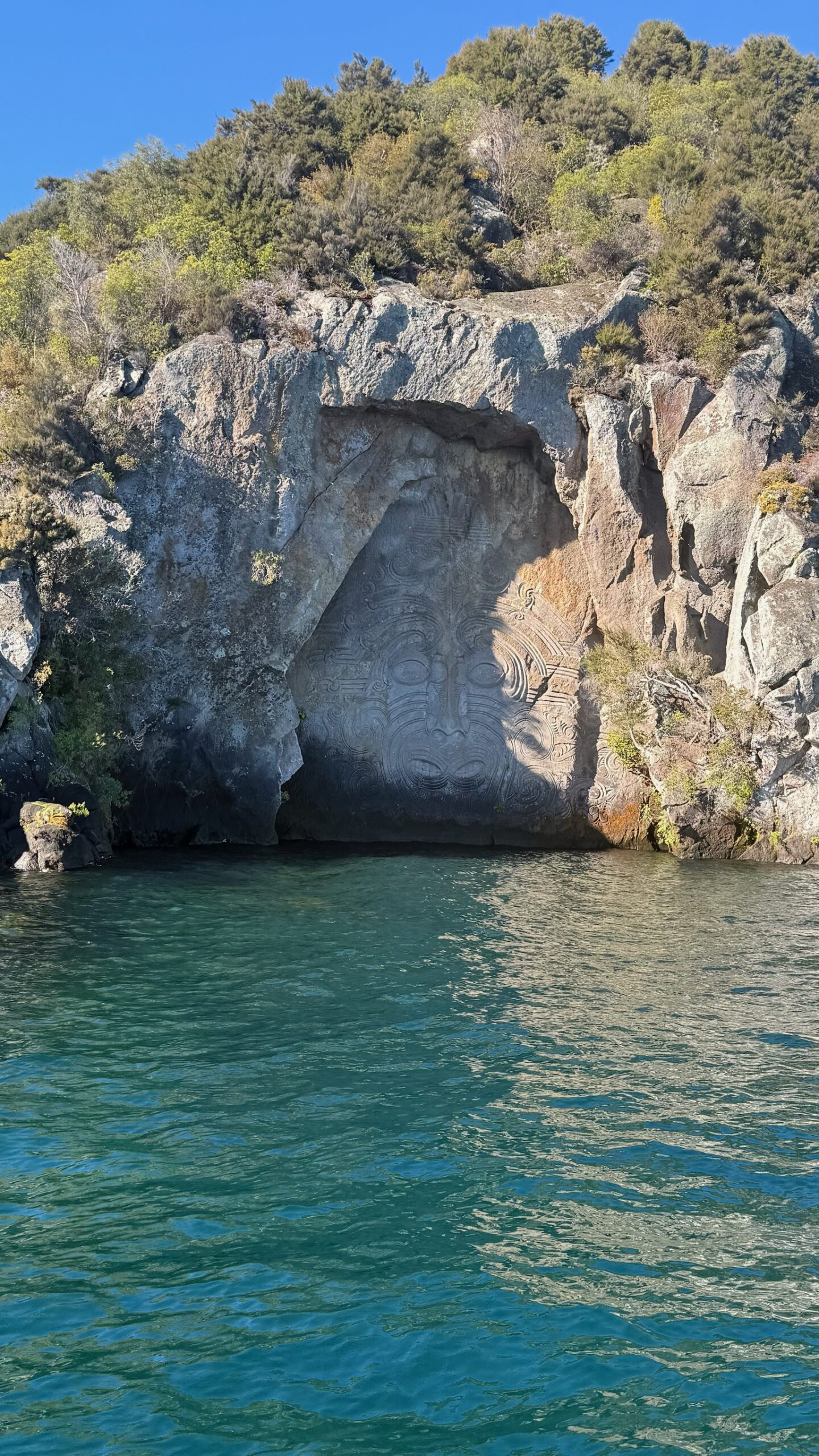 Nous en profitons pour faire un tour en bateau et admirer les célèbres sculptures maories de Mine Bay. Taillées à même la falaise dans les années 1970 par l’artiste Matahi Whakataka-Brightwell, elles représentent un visage de sage maori et d’autres motifs symboliques. Avec ses 10 mètres de haut, c’est assez impressionnant !