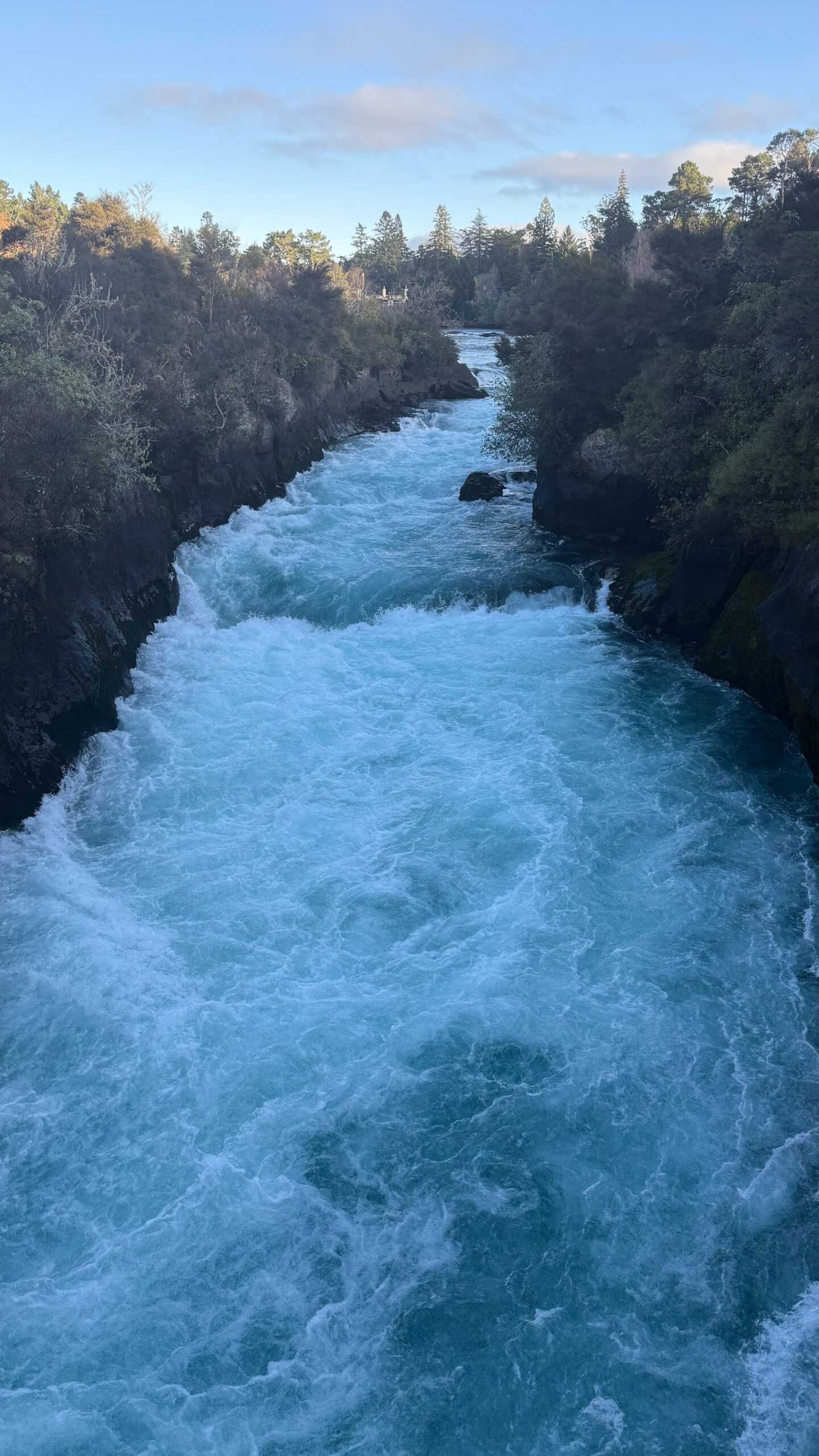 - Les chutes Huka offrent un spectacle impressionnant. Là où la paisible rivière Waikato se resserre brusquement, plus de 200 000 litres d’eau par seconde s’engouffrent avec puissance dans un étroit goulet pour former ces chutes rugissantes.